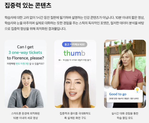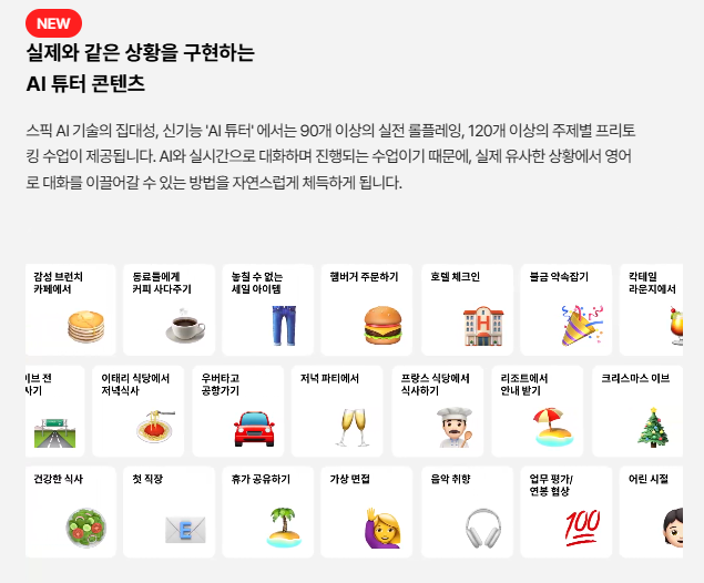 | 장점 | 시간과 장소에 구애받지 않고 학습 가능 실제 말하기 연습에 중점을 둔 학습 방식 반복 학습을 통한 자연스러운 표현 습득 다양한 주제와 상황별 회화 학습 가능 AI 튜터를 통한 부담 없는 대화 연습 |