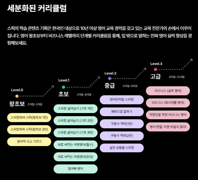 스픽의 메인 수업 기능은 초보부터 고급 학습자까지 모두 활용할 수 있는 체계적인 커리큘럼으로 구성되어 있습니다. 4단계 레벨을 기반으로 학습자는 자신의 실력에 맞춘 커리큘럼을 선택할 수 있습니다.